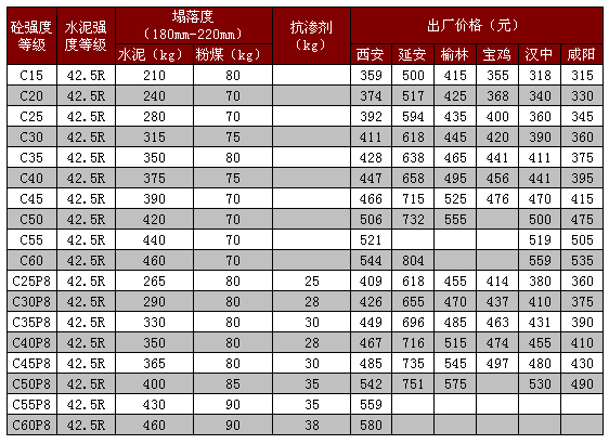 注:1、C50使用了1-2CM碎石,其余強度等級均使用1-3礫石、中砂。