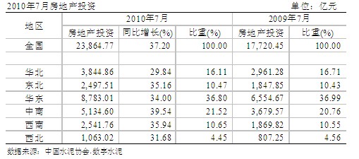 2010年1~7月份,房地產投資較去年同期增長37.2%,基本保持穩定,中南地區仍然保持最快增速,但速度小幅放緩,華北地區繼續維持自年初來的下滑趨勢。地區中,海南、福建、廣西增長超過60%;河北省也保持52%的同比增速,居全國第四位。