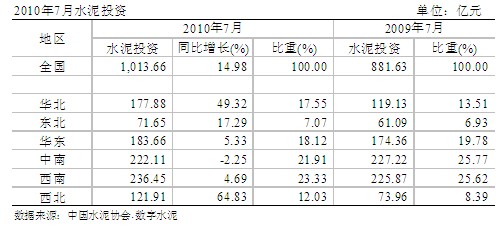 基于已開工項目的延續性,2010年1~7月份,水泥投資額繼續增加,并突破千億元,但累計同比增速繼續保持放緩態勢,為14.98%,水泥投資額排名首位的西南地區同比增速繼續保持放緩態勢,但幅度較小,僅比1~6月份下降0.34個百分點。地區中,四川投資額繼續保持首位,但繼續保持負增長狀態,投資額排名第二、第三位的河北、貴州兩地都保持較高的同比增速,分別為77.5%、117.3%。