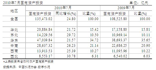 2010年1~7月份,城鎮固定資產投資額達135,473億元,同比增長24.8%,西北仍保持同比增速最快,為30.78%。地區中,海南省仍以43.9%的增速位居第1,廣西、寧夏、甘肅、黑龍江、湖北增速也排前列,均在35%以上。