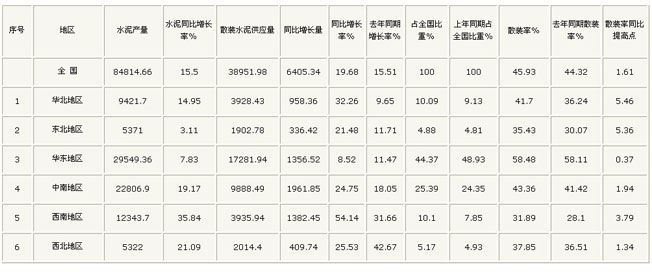 同期全國(guó)水泥生產(chǎn)量為84814.66萬(wàn)噸,比上年同期73429.76萬(wàn)噸增加了11384.9萬(wàn)噸,增長(zhǎng)15.5%,增幅高于去年同期2.19個(gè)百分點(diǎn)。散裝水泥增長(zhǎng)幅度高于水泥增長(zhǎng)幅度4.18個(gè)百分點(diǎn)。