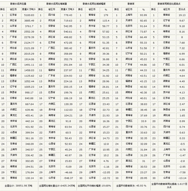 全國(guó)平均水泥散裝率為45.93%,比去年同期散裝率44.32%提高了1.61個(gè)百分點(diǎn)。