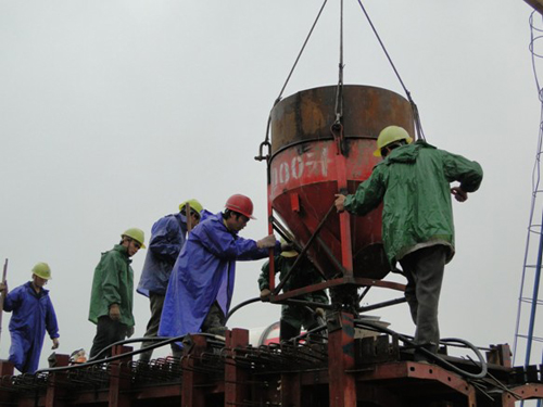 澆筑時,天空雖然下著毛毛細雨,但是工人們的干勁不減,早上10:00左右澆筑工作在震耳的鞭炮聲中正式開始,在龍門吊的配合下,混凝土準確地入模澆筑,下午13:00左右成功澆筑完畢。第一片30米預制T梁澆筑圓滿成功,為預制場全面展開工作,為整個項目的順利推進打下了堅實基礎。