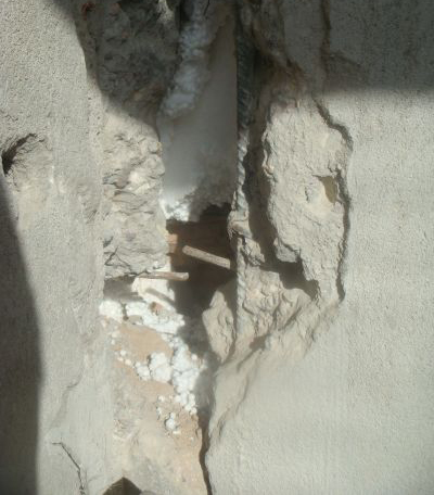 記者看到,寬大的裂縫里面就是厚厚的白色塑料泡沫,此時雖然已經被房主挖出很多,但記者還是一伸手就從立柱里面抓出一把塑料泡沫,并且通過肉眼觀察,就能很明顯的看出,立柱自上而下除了外部一層薄薄的水泥之外,還有很多白色塑料泡沫填充在里面。并且立柱里面的鋼筋也是斷裂的,根本沒有連在一起,并且兩堵墻之間的鋼筋只伸出兩指寬,根本不能把兩堵墻緊緊相連。