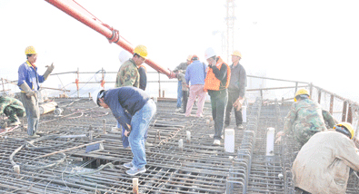 為了確保第一段箱梁順利澆筑施工,在箱梁鋼筋綁扎完畢、立好模板后,項目部專門組織有關人員對其進行了首件檢驗,對全體參加施工人員召開了安全和技術交底會。此次澆筑的零號塊就是懸臂澆筑梁的第一段梁塊,主梁采用單箱單室直腹板截面,梁高采用圓曲線變化,造型優美,線條流暢,是整個連續梁的關鍵工序。該零號塊座落在安慶長江大橋北岸高達24米的W8號橋墩頂端,長10米、高7.5米、寬12.2米,共澆筑C50高性能混疑土298立方米。零號塊澆筑成功后,將在上面安裝施工掛籃,同時向大橋南北兩側進行懸臂澆筑橋梁施工。