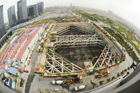 在一個占地面積比標(biāo)準(zhǔn)足球場還大的基坑內(nèi),18臺輸送泵、180輛攪拌車來回奔馳、一次性完成4萬立方米大底板的混凝土澆筑……在建中的寧波第一高樓——寧波環(huán)球航運廣場今天就可完成底板澆筑。這也創(chuàng)下了我省民用建筑一次性連續(xù)澆搗最大方量基礎(chǔ)底板的新紀(jì)錄,僅次于今年上半年中國第一高樓“上海中心”的6.1萬立方米大底板混凝土澆筑,著名的上海金茂大廈此前的底板澆筑量也僅2.8萬立方米。