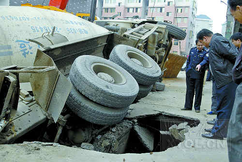 11月16日11點40分,湘潭縣易俗河梧桐小區內傳來一聲巨響,一臺滿載混凝土的攪拌運輸車傾倒在路邊。讓人吃驚的是,它并不是被絆倒的,而是陷進了承受不了足夠壓力的路面。