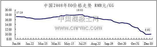 二、MPEG的原材料環氧乙烷(EO)作為石油的衍生品,也不可避免地受其影響。2008年EO價格從年初的17000元/噸漲至7月份的18020元/噸,下半年又直線下滑跌落至10000元/噸左右,較年初相比跌幅達40%(如圖三),如此價格創下近年來新低。