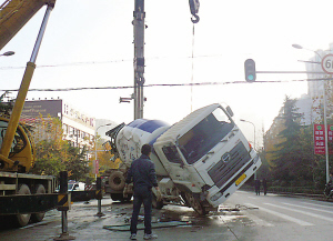 12月5日武昌中山路公平路口一輛滿載混凝土的水泥槽罐車發生側翻,幸未造成人員傷亡。