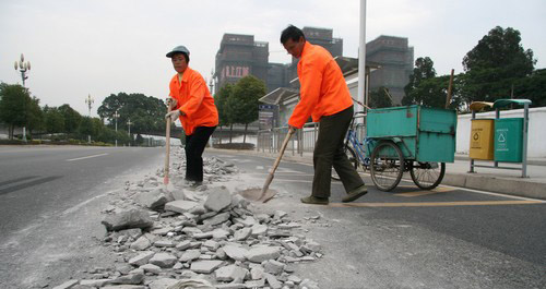 隨后,幾名環衛工拿著鐵鏟來到現場清理這些建筑垃圾。