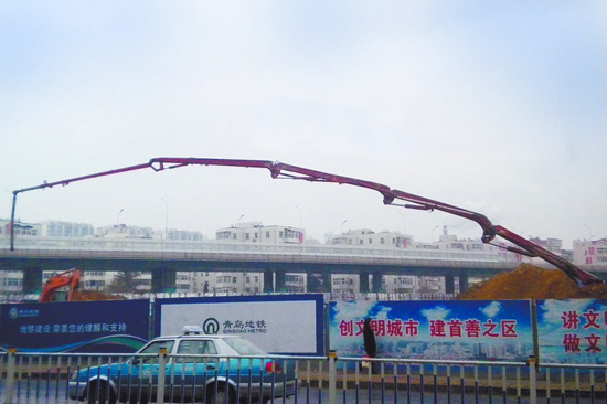 青島地鐵寧夏路站泵車伸出長臂灌泥漿