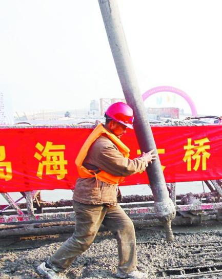 “我們從21日上午10時(shí)開(kāi)始進(jìn)行澆筑,這段施工斷面前后共有43米長(zhǎng),現(xiàn)在只剩下20平方米沒(méi)有澆筑”,12月22日在海灣大橋第八合同段,負(fù)責(zé)現(xiàn)場(chǎng)施工的中交四工局負(fù)責(zé)人張瑞和介紹,這里就是大橋貫通前最后要澆筑的橋面。
