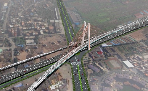 廣州,2010年12月28日 貴廣鐵路最大鋼橋主塔下橫梁混凝土澆筑完成 這是跨穗鹽路斜拉橋設計效果圖。