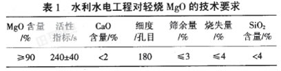 直接將粉狀MgO膨脹劑與混凝土的其它原材料(如水泥、碎石、砂子、粉煤灰等)一起攪拌而成的混凝土,可以根據混凝土結構設計要求的補償收縮量,通過調整MgO膨脹劑的緞燒設備、燒成溫度、高溫下的保溫時間、摻量、外摻混合材的種類等手段來調節混凝土的膨脹速率和膨脹量。利用這種方法配制M沙微膨脹混凝土,相對使用內含MgO量較高的水泥而言,方便靈活,實際工程應用較多[9]。1994年,能源部、水利部水利水電規劃設計總院頒發了用于水利水電工程的輕燒M四膨脹劑的技術要求— 《水利水電工程輕燒MgO材料品質技術要求以行),見表1。
