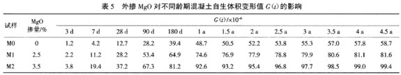 將編號為MO、M1、M2的混凝土力學性能實驗試件脫模后放置于恒溫(20士2)℃、相對濕度不低于95%的環境中養護,變形試件放置于恒溫(20士2)℃、絕濕環境中養護,測得混凝土試件的力學性能、體積變形值G(t)及它們隨MgO摻量變化的相對結果和隨時間t變化過程曲線分別見表4、表5,圖1。