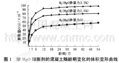 工程實踐表明,大體積混凝土澆筑后,由于水泥的硬化,散發大量的熱量,使混凝土的溫度迅速上升。待達到最高溫度后,隨著熱量向外部釋放,混凝土溫度將緩慢下降至一個穩定溫度,最高溫度與穩定溫度之差在20℃左右,需要的補償收縮量約20×10-6?;炷羶炔繙囟乳_始下降的時間一般是從混凝土澆筑后的7d起,持續時間可達幾年至幾十年(因混凝土的熱傳導性能差)。而MgO混凝土的膨脹主要發生在大體積混凝土的降溫收縮階段(即齡期7一90d),之后,每年的膨脹量僅增加(0.5-3×10-6,并逐漸趨于穩定。因此,利用好MgO混凝土的延遲微膨脹特性,能夠補償大體積混凝土在降溫階段產生的體積收縮,提高混凝土自身的抗裂能力。然而,使用硫鋁酸鈣類、氧化鈣類、硫鋁酸鈣一氧化鈣類膨脹劑的混凝土,其在非水養護環境中的膨脹變形主要發生在早期(一般為混凝土澆筑后的1一7d內),且之后大多呈收縮狀態[2-3],0],難以滿足補償大體積混凝土冷縮的要求。