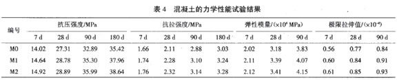 (l) 在相同條件下,外摻MgO膨脹劑的混凝土各個齡期的力學性能指標均比未摻的高,并隨著MgO摻量的增加而增大。以90d齡期為例,外摻MgO膨脹劑的混凝土的抗壓強度、抗拉強度、彈性模量和極限拉伸值均比未摻的提高6%-9%。