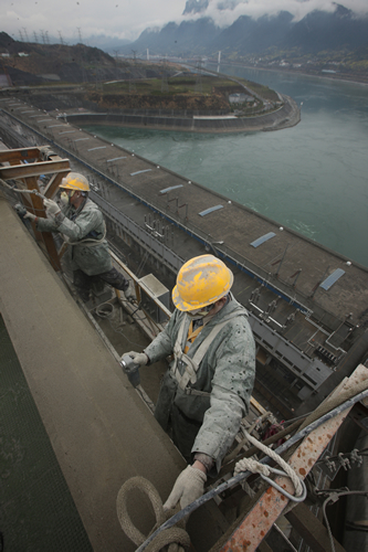 日前,由中核二二公司三峽電站項目部承擔的三峽大壩壩面混凝土保護涂刷工程正加緊進行。涂刷工程在今年6月份全部結束后, 三峽大壩將穿上"新衣"。據了解,這種涂刷在大壩混凝土表面的新型透明保護涂料,可以有效防止壩面混凝土因長期風吹雨淋而變色,并產生氧化反應,影響大壩美觀。