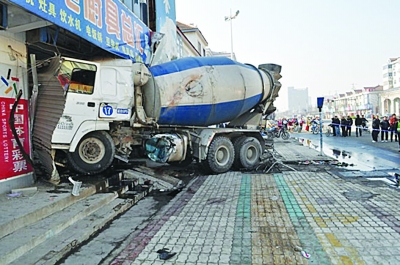 經營廚具生意的店主祁先生無奈地看著現場。他說自己在這里租房做生意十多年了,平時,15歲的兒子小祁一個人睡在店里。當晚,他聽到出事就飛奔而來,還好兒子平安無事。不少市民注意到,店面和路面之間還有半米多高的臺階,幸虧這個臺階,水泥攪拌車的慣性被削弱了不少,否則后果更嚴重。