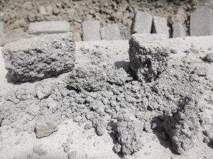 昨天記者調查時施工單位承認因工期太緊,使用的是提前出廠的混凝土磚,強度不夠。