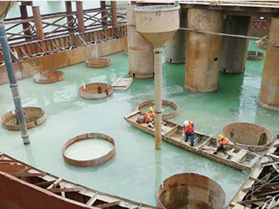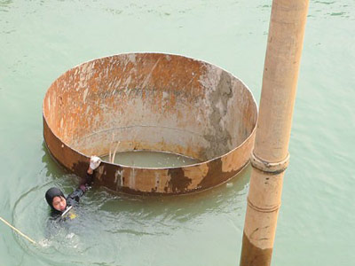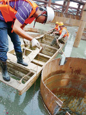 此時,施工人員往水里澆灌混凝土,以形成一個混凝土地板,之后再將套箱里的水抽干,這樣工人在套箱里面施工就好像在陸地上施工一樣。灌混凝土之前,5位潛水員輪流下水,在10多米深的水中摸索,一是看套箱壁是否有漏洞,二是看用于承載水下混凝土的圓形護(hù)筒是否有泥漿。由于在水里不能呆太久,每次只能讓一兩位潛水員下去,5位潛水員輪流下水檢查,如沒有問題,就可以往套箱內(nèi)澆灌混凝土了。