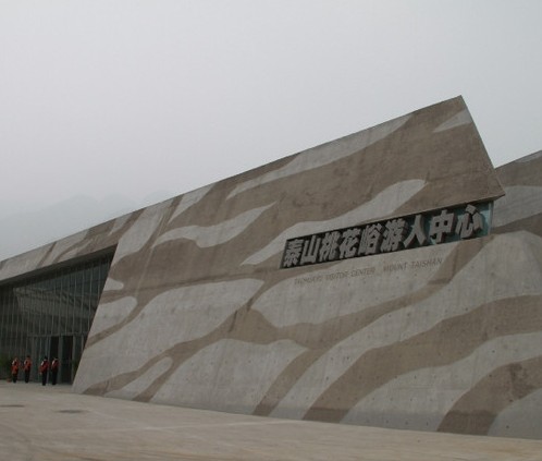 泰山桃花峪游人中心建筑是一組不規(guī)則的幾何體,像幾塊散落在桃花峪山口的巨型巖石,蔚為壯觀。它是由中國十大建筑設(shè)計(jì)大師之一崔愷先生主持規(guī)劃設(shè)計(jì),集車輛停放、游人集散、信息展示、旅游咨詢等多功能于一體的綜合性旅游服務(wù)基礎(chǔ)設(shè)施,項(xiàng)目規(guī)劃總占地80.3畝。跳動(dòng)的彩石紋理揮灑著最本質(zhì)的美感,純粹的建筑語言詮釋出回歸本土的理念。這就是泰山桃花峪游人中心——國內(nèi)首座大面積采用傾斜清水混凝土墻體的美麗建筑。它不僅是一座現(xiàn)代化游人服務(wù)中心,同時(shí)其獨(dú)特的建筑形式也成為一處新的旅游亮點(diǎn),可增加游客在泰山的滯留時(shí)間,將游客由傳統(tǒng)的中軸線旅游向泰山西翼拓展,并帶動(dòng)泰山西翼休閑度假旅游的發(fā)展,成為泰山腳下的點(diǎn)睛之筆。