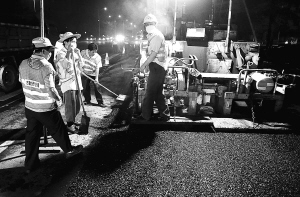 5月10日凌晨,在海口市丘海大道,市政維修工人在專家指導下,利用新型材料巖瀝青改性瀝青AC-13C型瀝青混凝土維修路面。該材料可緩解傳統瀝青路面遇高溫、雨水時出現車轍、擁包、裂縫等病害的狀況,試驗后如確實可行,將在海口市各主要路段推廣使用。