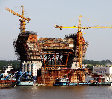 安慶長江鐵路大橋4號墩主塔下橫梁為預應力混凝土結構,采用雙室空心矩形結構,高8米,寬14米,長約42米(不包括相應的塔身部分),橫梁施工分2次,本次施工高度為3.5米,一次性完成混凝土方量達2378立方米,歷時30多個小時。