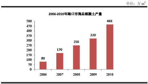 2010年以來,隨著國際旅游島建設的不斷深入開展,在房地產和基礎設施建設等固定資產投資高速增長的拉動下,商品混凝土的市場需求逐步升溫,給海南省商品混凝土企業帶來新的發展機遇,企業家數也逐步增多。據不完全統計,目前海南省具有一定規模的商品混凝土企業家數超過40家,隨著新增商品混凝土企業的產能逐步釋放,海南省商品混凝土的普及率有望進一步提高。
