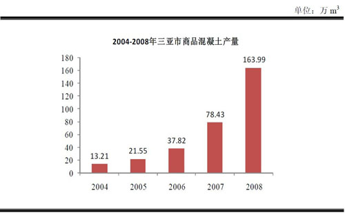 近兩年三亞市商品混凝土產量繼續保持了較高的增長速度,2009年產量為206.35萬m3,2010年產量達到255.66萬m3。由于三亞市商品混凝土市場需求旺盛而企業家數較少,商品混凝土整體產能利用率處于較高水平。截至2010年底三亞市全市共6家商品混凝土企業,設計產能合計為410萬m3,總體產能利用率為62.36%,遠高于全國平均水平。