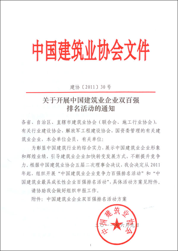 為彰顯中國建筑行業的綜合實力,展示中國建筑業企業形象和輝煌業績,樹立企業“品牌”形象,提升企業競爭力,中建協將組織開展“中國建筑業企業競爭力百強排名活動”和“中國建筑業最具成長性企業百強排名活動”,現將建協[2011]30號文轉發你單位,請收到通知后,在中國建筑業協會網(www.zgjzy.org)下載活動實施方案和申報表,根據企業經營狀況自愿申報,并請于2011年7月7日前將申報資料文字版(一式二份)、電子版(一式一份)報河南省建筑業協會,由省建協簽署預審核推薦意見后統一報中國建筑業協會。