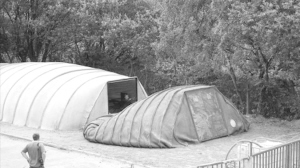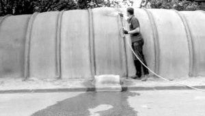 混凝土帆布帳篷裝在箱子里運送到部署現(xiàn)場。在這里,需要做的僅僅是解包,將卷形的帆布展開,接上空氣壓縮泵,朝充氣囊內(nèi)灌注空氣,充氣囊像充氣玩具那樣膨脹成型,把帆布包撐成帳篷。之后,只需要用水對其帳篷外部徹底大沖刷,使用臟水也無妨,讓嵌入帆布的混凝土水合化。