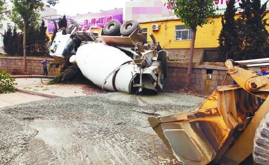7月16日上午,在李滄區(qū)瑞金路一公司門前,一輛大型混凝土攪拌車在裝完混凝土準備稱重量時,不知什么原因,突然翻下落差近2米的路邊,駕駛員被困車內,被隨后趕到的工友從車內救出,所幸駕駛員無大礙。