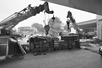 11時左右,兩輛大型吊車合力將攪拌車拖出高架橋底部,終于將事故車吊起扶正。