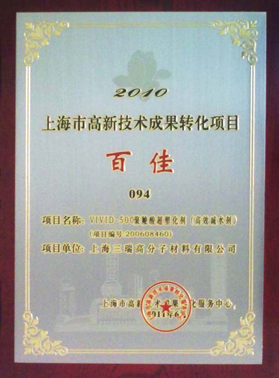 VIVID-500聚羧酸超塑化劑(高效減水劑)于2006年9月被認定為上海市高新技術成果轉化項目。近年來,產品成功應用于大批國家重點工程中,取得了顯著的經濟效益和社會效益。在2010年度上海市眾多高新技術成果轉化項目中,名列百佳,為公司贏得了榮譽。