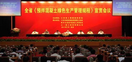 2011年4月13日,省住房和城鄉(xiāng)建設(shè)廳發(fā)布第116號公告,批準(zhǔn)《預(yù)拌混凝土綠色生產(chǎn)管理規(guī)程》為江蘇省工程建設(shè)標(biāo)準(zhǔn),自2011年6月1日起實施。為了做好規(guī)程的貫徹實施工作,經(jīng)省住房和城鄉(xiāng)建設(shè)廳同意,由江蘇省工程建設(shè)標(biāo)準(zhǔn)站主辦,江蘇省建筑鋼結(jié)構(gòu)混凝土協(xié)會、南京市預(yù)拌混凝土管理處、三一重工股份有限公司聯(lián)合承辦的全省《預(yù)拌混凝土綠色生產(chǎn)管理規(guī)程》宣貫會議于2011年7月27日在南京召開。各省轄市建設(shè)主管部門的分管領(lǐng)導(dǎo)和有關(guān)處室負(fù)責(zé)人,環(huán)境保護、散裝水泥主管部門的相關(guān)領(lǐng)導(dǎo),大中型預(yù)拌混凝土企業(yè)主要負(fù)責(zé)人,以及各級混凝土行業(yè)協(xié)會組織負(fù)責(zé)人近300人出席了會議。