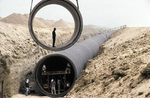 韓國技術(shù)人員1999年在利比亞大水渠工程工地上連接大型混凝土管道