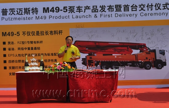 接著張金望博士(CEO)發表熱情洋溢的講話:他代表公司,歡迎各位領導、嘉賓、同事參加M49-5發布會,歡迎并感謝遠道而來的媒體朋友們。目前全球經濟不景氣,對中國的市場也有很大的影響,特別是對混凝土機械廠家來說,是一次大的考驗。同時市場競爭激烈,我們就是要迎著困難前進,在這個時候我們隆重推出這個M49-5這個產品可以說是非常及時,這款產品在節油、穩定性、運營成本等方面具有獨特的優勢,其中運營成本較低,能給客戶帶來更多的效益,感謝第一個購買M49-5泵車的郭總。希望這個泵車能給郭總及更多的人帶來利益,做到雙贏。最后他還要再次感謝產品研發團隊,感謝技術總監蘇建良先生。感謝這個團隊。