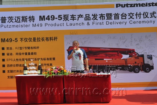 發布會的開始Dr. Karch致歡迎詞,他激動的說:“感謝大家前來參加M49-5產品發布會。這款泵車集中體現出了普茨邁斯特50年來技術經驗。希望能給客戶帶來更多的利益,這款泵車的研發和成功下線是我們產品的又一次進步與成功,并同時也希望今后還能和客戶及大家一起成功。他感謝產品研發團隊,感謝負責PM49-5技術總監蘇建良先生。感謝他作出的卓越貢獻。