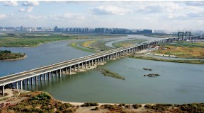 陽明灘大橋長7.13公里,橋面鋪裝施工的運輸車輛只有南北兩側橋頭上下橋面,給橋面瀝青混凝土鋪裝材料運輸帶來了一定困難。為加快施工進度,同時為保證其他附屬工程能夠平行交叉作業,指揮部組織施工單位科學論證施工方案,合理安排施工順序,并于8月19日起,按照由主橋到引橋,左右單幅輪換鋪裝的順序對四個標段逐段啟動鋪裝施工,每幅鋪裝時都由20臺料車配合兩臺攤鋪機同時攤鋪,后跟4臺雙鋼輪壓路機和兩臺膠輪壓路機共同實施碾壓作業,確保每一平方米瀝青混凝土的碾壓次數不小于11次。同時,在攤鋪過程中,各標段監理單位和哈工大瀝青鋪裝課題研究小組進行跟蹤監督并隨時抽檢,通過實時監測瀝青混凝土溫度、厚度平整度及壓實度等技術指標,及時控制施工細節,有效保證了整體鋪裝施工質量。