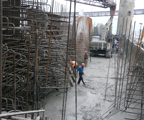 向家壩二期工程泄洪大壩共布置10個泄洪中孔,每個中孔從進(jìn)口段檢修門槽至出口工作門槽過流面為全斷面不銹鋼復(fù)合鋼襯,進(jìn)水口鋼襯安裝高程在302.5米,鋼襯底板高程為305米。每孔鋼襯腹部混凝土需2倉次達(dá)到進(jìn)水口底板高程,首倉在泄洪11壩段甲乙塊下游開澆,第二倉將在上游澆至中孔鋼襯底板高程,鋼襯腹部混凝土澆筑為四季度土建工作的難點和重點。