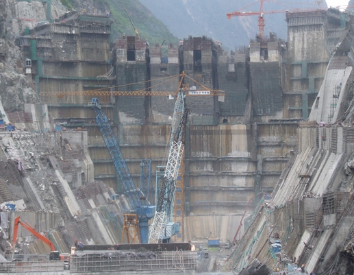 六月份以來,雅礱江逐漸進入汛期,暴雨連綿,江中水位不斷抬升,給施工帶來了極大阻力。二公司項目部及時啟動了應急預案,組織安全人員交錯時段地對施工現場進行巡查,排查隱患,切實做到發現一處,完善一處,同時項目部優化人力、物力配置,全力組織生產,克服了重重困難,在生產條件較為惡劣的情況下,實現了生產進度的快速推進。2011年大壩完成混凝土澆筑40多萬方,基本實現了時間過半、任務過半的目標,目前,大壩澆筑按計劃全力推進。