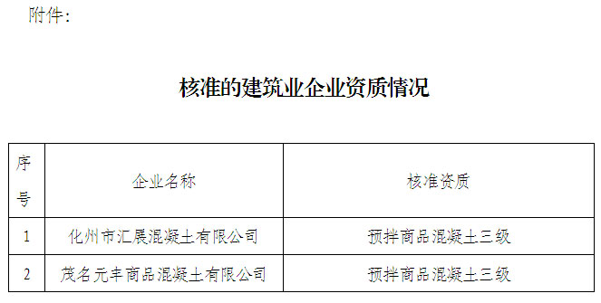 茂建公告〔2011〕4號 根據《行政許可法》、《建筑業企業資質管理規定》(建設部令第159號)等相關規定,經組織專家評審并公示,局核準了化州市匯展混凝土有限公司、茂名元豐商品混凝土有限公司等2家建筑業企業資質(詳見附件),現予公告。