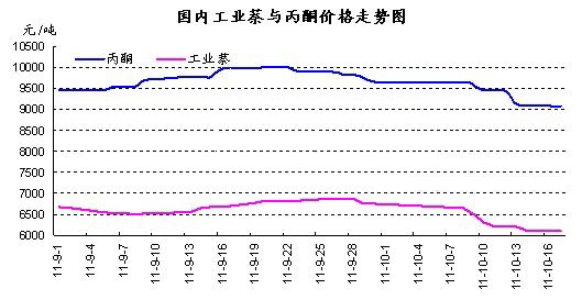 1、價格走勢:工業(yè)萘從9月17日左右開始在前期緩坡上漲后一周時間里短暫盤整,之后開始下滑,即從6400-6800元/噸的主流價格一路下跌至9月30日價格在6100-6500元/噸,跌幅在300元/噸。國慶節(jié)小長假過后,10月8日上班以后,工業(yè)萘價格低位徘徊,6000-6100元/噸的主流價格持續(xù)到17日,低端已到5800元/噸,高端僅為6350元/噸。