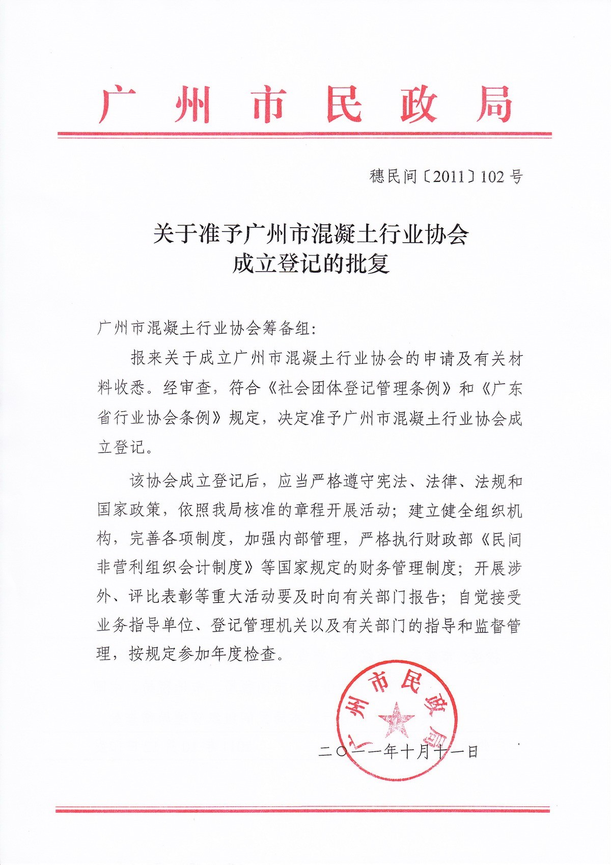 廣州市民政局于2011年10月11日發出《關于準予廣州市混凝土行業協會成立登記的批復》(穗民間[2011]102號),決定準予廣州市混凝土行業協會成立登記,并發給《社會團體法人登記證書》(社證字第4401000798號)。