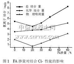 硅酸鹽水泥混凝土中,化學結合氯化物的主要成分是水泥的C3A 相。C3A 相首先與硫酸鹽反應生成鈣礬石( 硫鋁酸鈣), 然后與氯化物反應生成低溶性的單氯鋁酸鈣3CaO·Al2O3·CaCl2·10H2O,即所謂費氏鹽(Friedel 鹽)。同時,水泥的C4AF 相也會與氯化物生成類似的3CaO·Fe2O3·CaCl2·10H2O,但前者的結合能力遠大于后者。水泥中C3A含量越高,水泥用量越高,氯化物就結合得越多,越有利于保護鋼筋。而FA 中Al2O3 的含量比水泥高的多,等量取代水泥后,二次水化反應生成的硫鋁酸鈣比不摻FA 的要多,這樣就生成的更多的Friedel 鹽,提高的化學結合的能力。