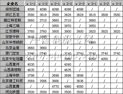 2009年6月10日至2009年6月16日招標(biāo)文件發(fā)售,多家經(jīng)鐵道部認(rèn)證的外加劑企業(yè)參與了此次投標(biāo),各標(biāo)段投標(biāo)價(jià)格如下,僅供參考。