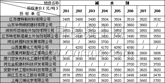 2009年7月14日新建南京至杭州客運(yùn)專(zhuān)線站前及相關(guān)工程甲控物資招標(biāo)進(jìn)行了開(kāi)標(biāo),現(xiàn)將減水劑各廠家投標(biāo)單價(jià)公布如下: