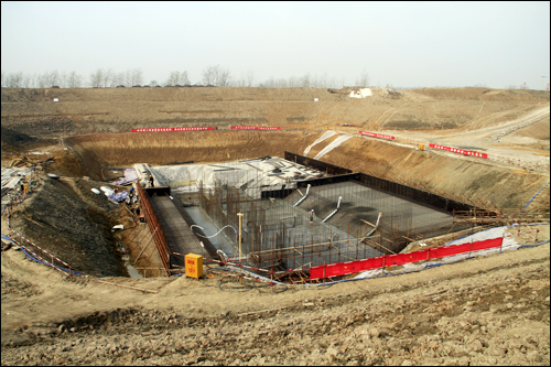 泗洪站的泵站基坑共設有兩塊底板,分別為三聯孔底板和二聯孔底板,本次的澆筑位置為三聯孔底板的第一層。澆筑前,東線江蘇水源公司組織專家對現場、原材料、拌合系統等進行了檢查指導,以確保工程質量。本次底板澆筑的完成也標志著泗洪泵站主體工程已進入全面實施階段。按工程進度,泵站底板澆筑將在12月之前全部完成。與此同時,調節閘工程、利民河排澇閘工程的相關工作也正按計劃緊張有序地穿插進行。