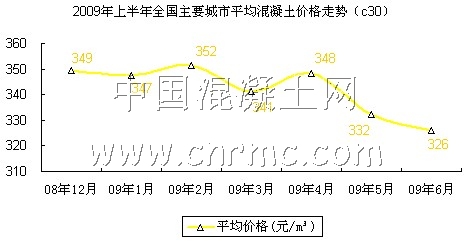 據(jù)中國混凝土網(wǎng)監(jiān)測數(shù)據(jù)顯示,2009上半年全國混凝土市場平均價格341元/立方(以c30混凝土為例)見表1,同比上漲9.62%。從價格走勢圖中可以看到, 2月價格最高352元/m³,6月價格最低326元/m³,見圖1。